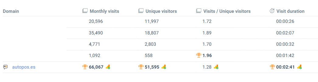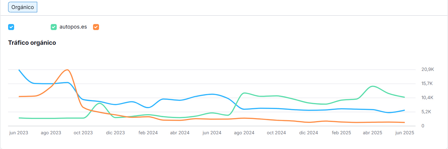 Según un reciente estudio, el tráfico SEO ha caído ya en un 70%. E irá a más. Una tendencia que, como puede verse en la tabla extraída del portal especializado en métricas y audiencias Similarweb -y que cualquiera puede consultar-, se ha trasladado también a los medios especializados en posventa –AUTOPOS.es, en verde-.